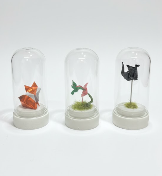 Pequeño domo transparente que resguarda un origami de colibrí. Un detalle sutil y refinado que celebra la belleza de lo simple. El colibrí nos recuerda la magia de lo esencial.